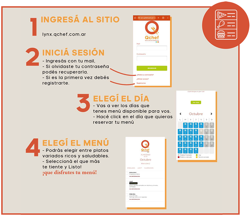 De manera mensual se cargará la alternativa de menues para que el personal autorizado pueda realizar su pedido. Los pedidos podrán ser solicitados mediante la APP con 72 hs. de anticipación.